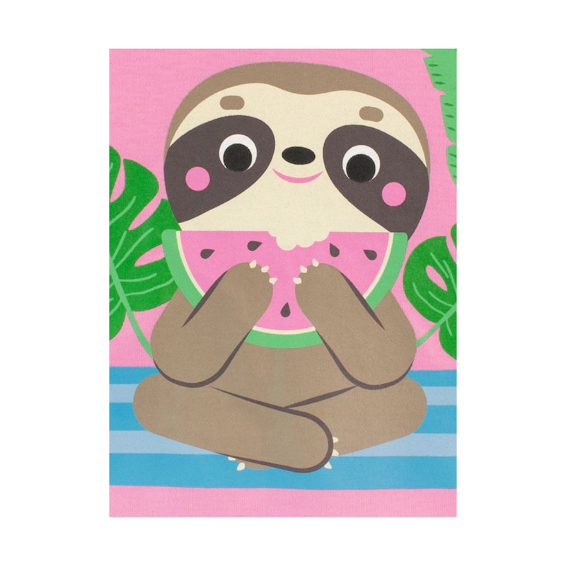 Bring summer vibes to bedtime with this adorable “Tropical State of Mind” pajama set! Featuring a sweet sloth enjoying a juicy slice of watermelon, the pink short-sleeve top adds a splash of fun to your little one’s sleepwear. The light blue shorts are sprinkled with watermelon prints and trimmed in pink for a fresh, playful look. Made from soft, breathable fabric, this set is perfect for warm nights and laid-back lounging!